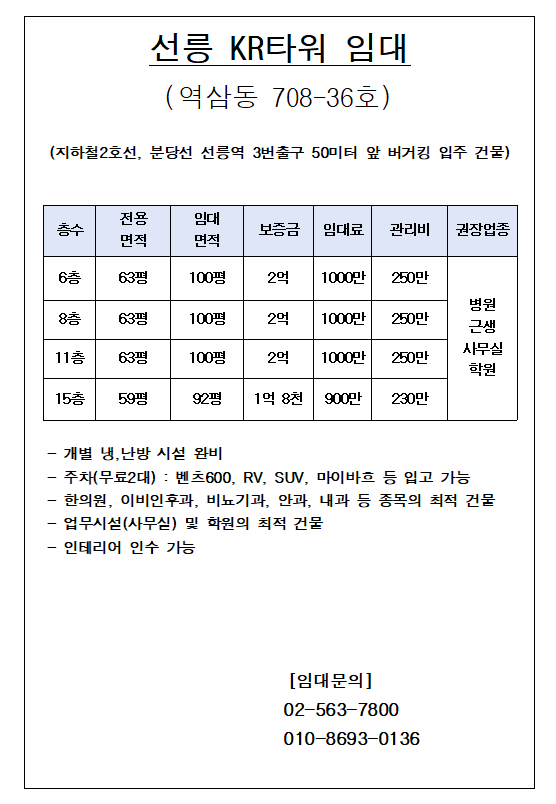 선릉역 3번 출구에서 도보 1분 역세권입니다. 유동인구가 많아 병원으로 최적의 건물입니다.